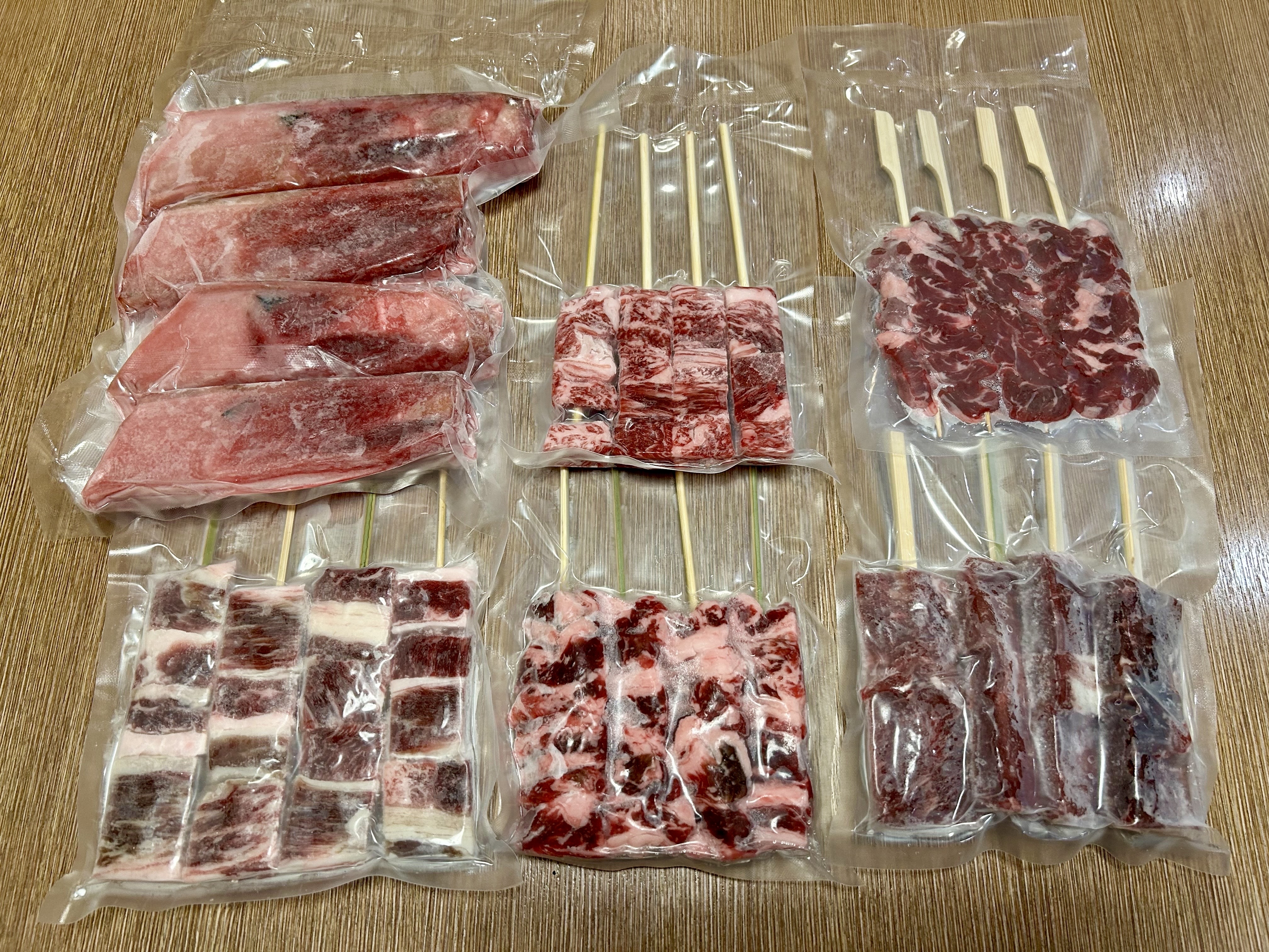 • 內容物:極上牛肋串*4支、厚切牛五花串*4支、菲力牛肉串*4支、鹿兒島A5雪花和牛串*4支、澳洲穀飼牛橫膈膜串*4支、黑鮪魚肩骨*4支